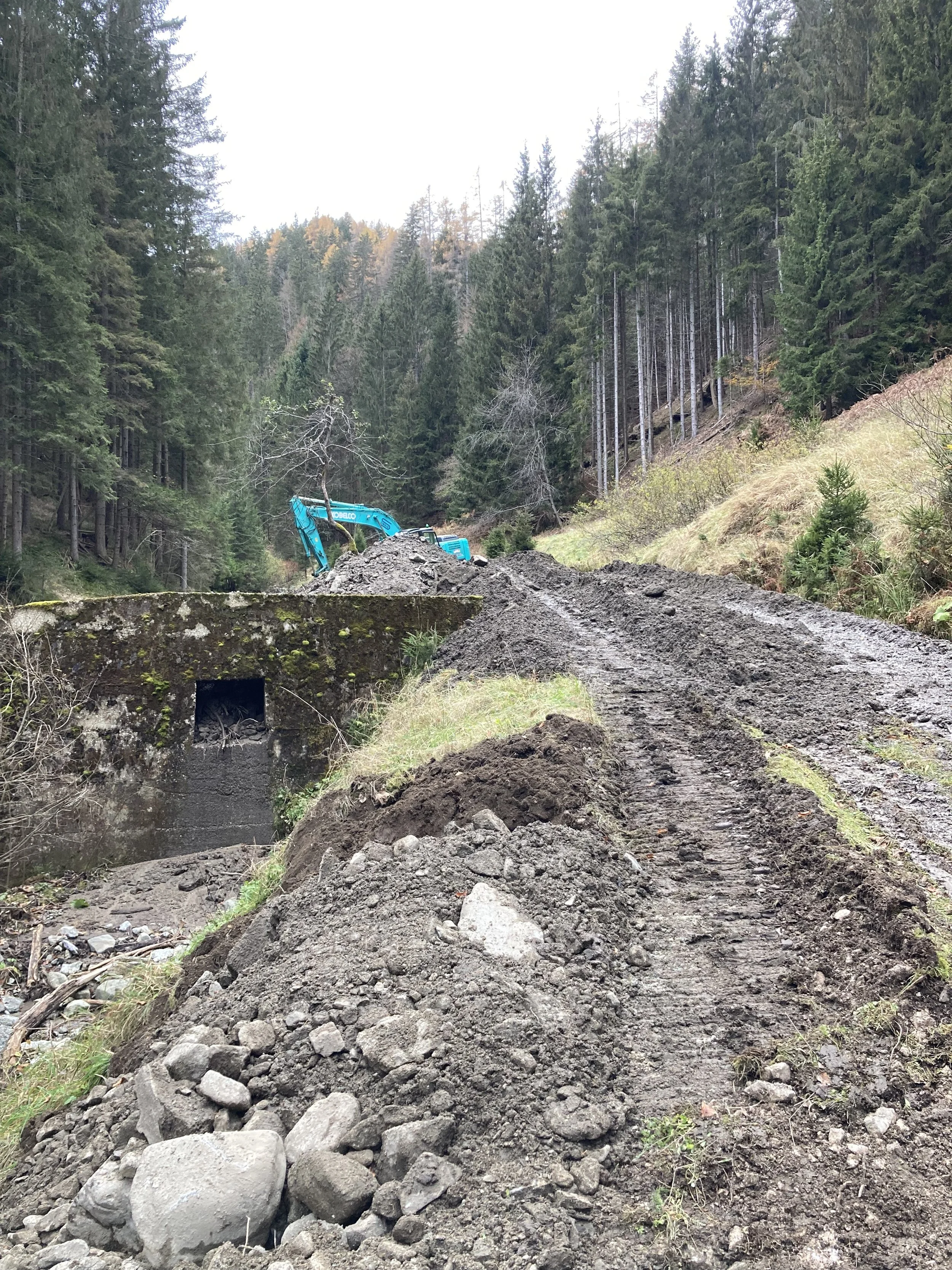 Once the initial shock settled, we began to respond. We brought old wood and natural materials back into the creek to help initiate recovery. The following year, after cutting spruce trees, we brought in a mulching machine to generate enough biomass to cover exposed ground and begin rebuilding soil. We also reopened access to the creek at several points, making it possible to approach it again.